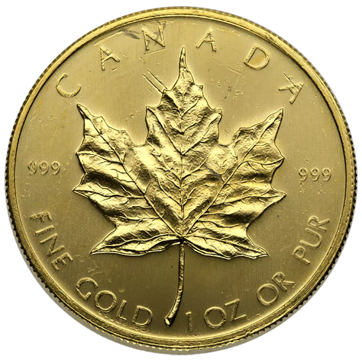 These 1 ounce Canadian gold coins have minor abrasions and scratches on the surface. The Canadian Gold Maple Leaf is the official bullion gold coin of Canada, and is produced by the Royal Canadian Mint (RCM). The brainchild of Walter Ott, it is one of the purest gold regular-issue coins in the world with a gold content of .9999 fineness (24 carats), with some special issues .99999 fine.