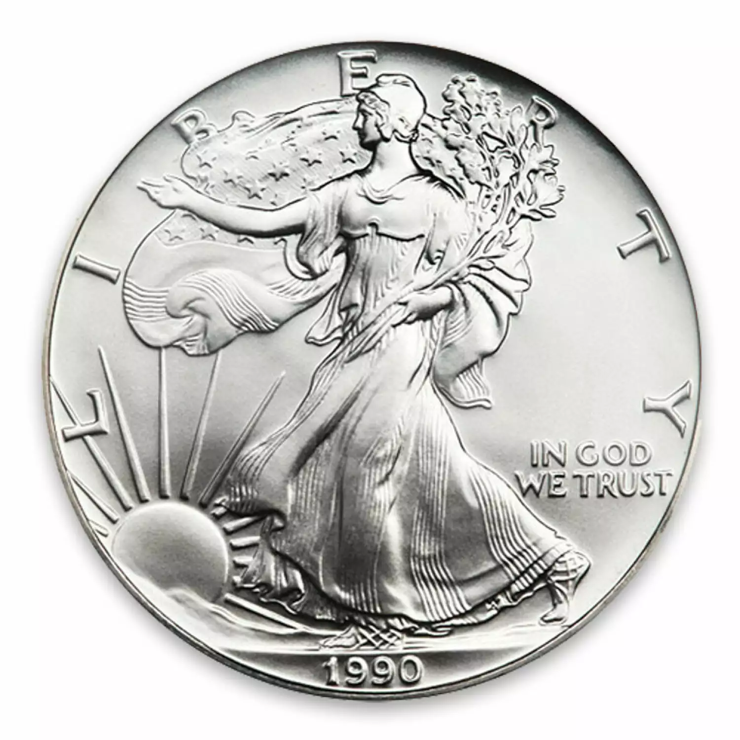 The 1990 Silver Eagle marked the fifth year of release for the American Silver Eagle series. This beautiful silver coin consists of 1 oz of .999 fine silver.