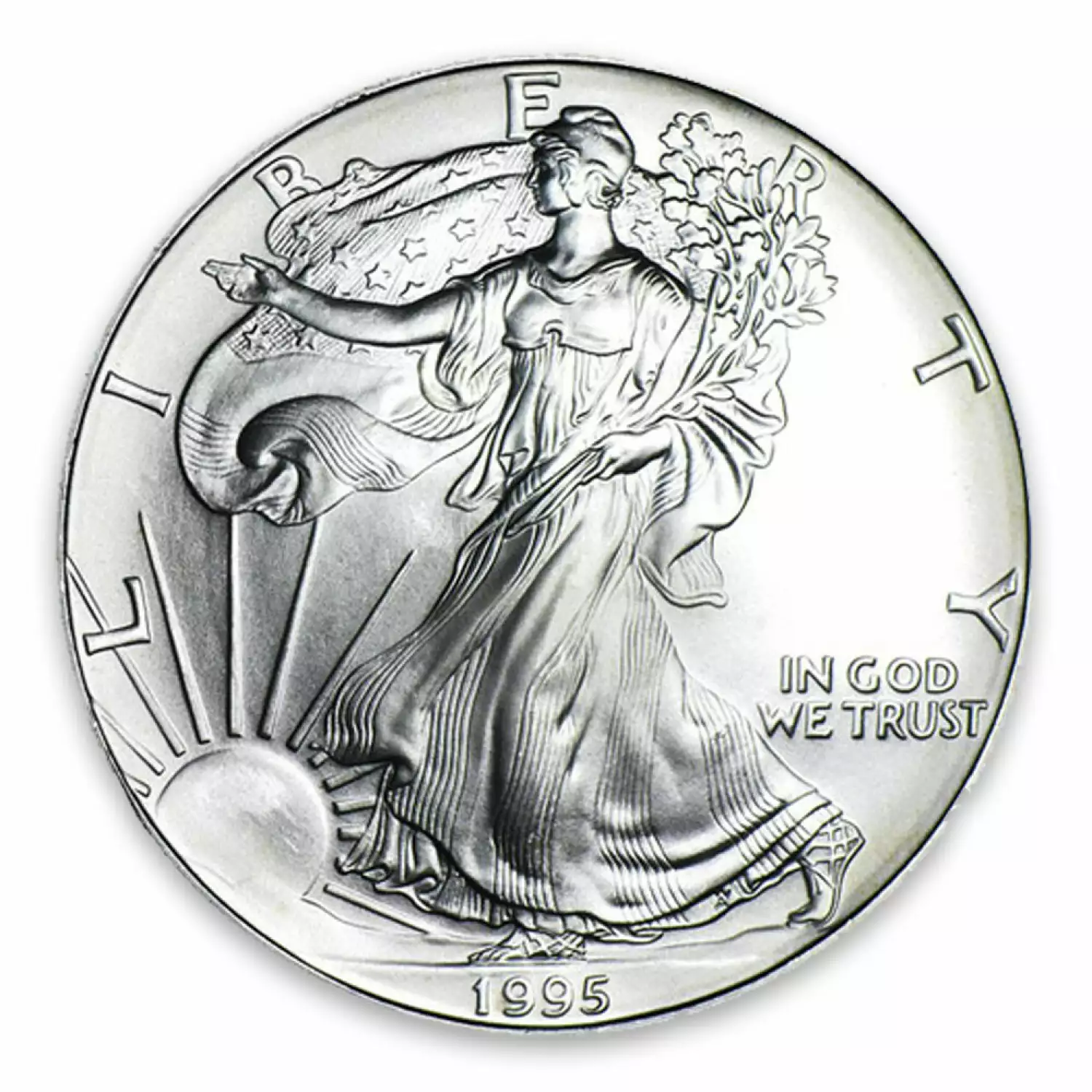 The 1995 1 oz American Silver Eagle contains 1 oz of .999 fine silver and has a face value of $1. The iconic design and purity of these silver coins make them highly popular among investors and collectors.