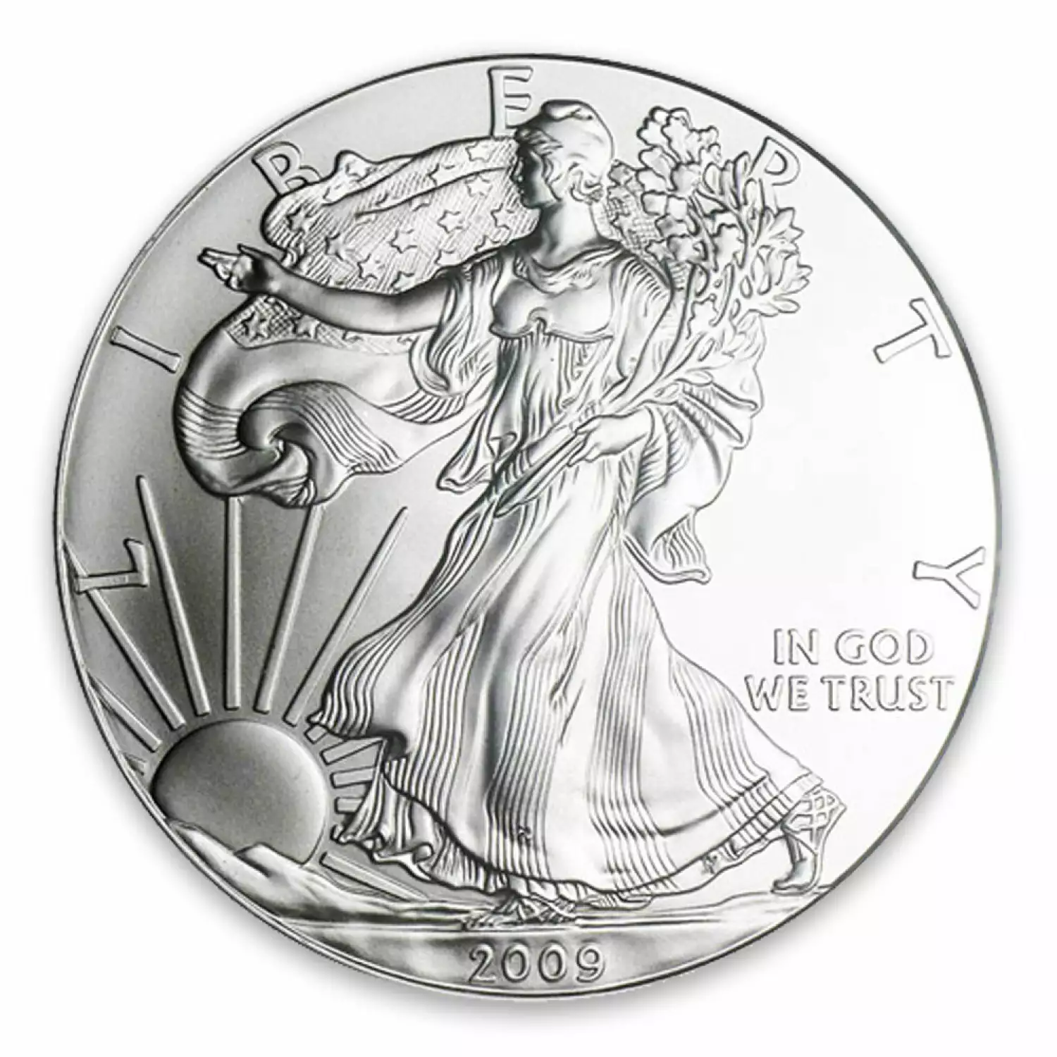 The 2009 1 oz American Silver Eagle contains 1 troy ounce of .999 fine silver and has a face value of $1. The beautiful patriotic design and purity of these silver coins make them highly popular among investors and collectors.