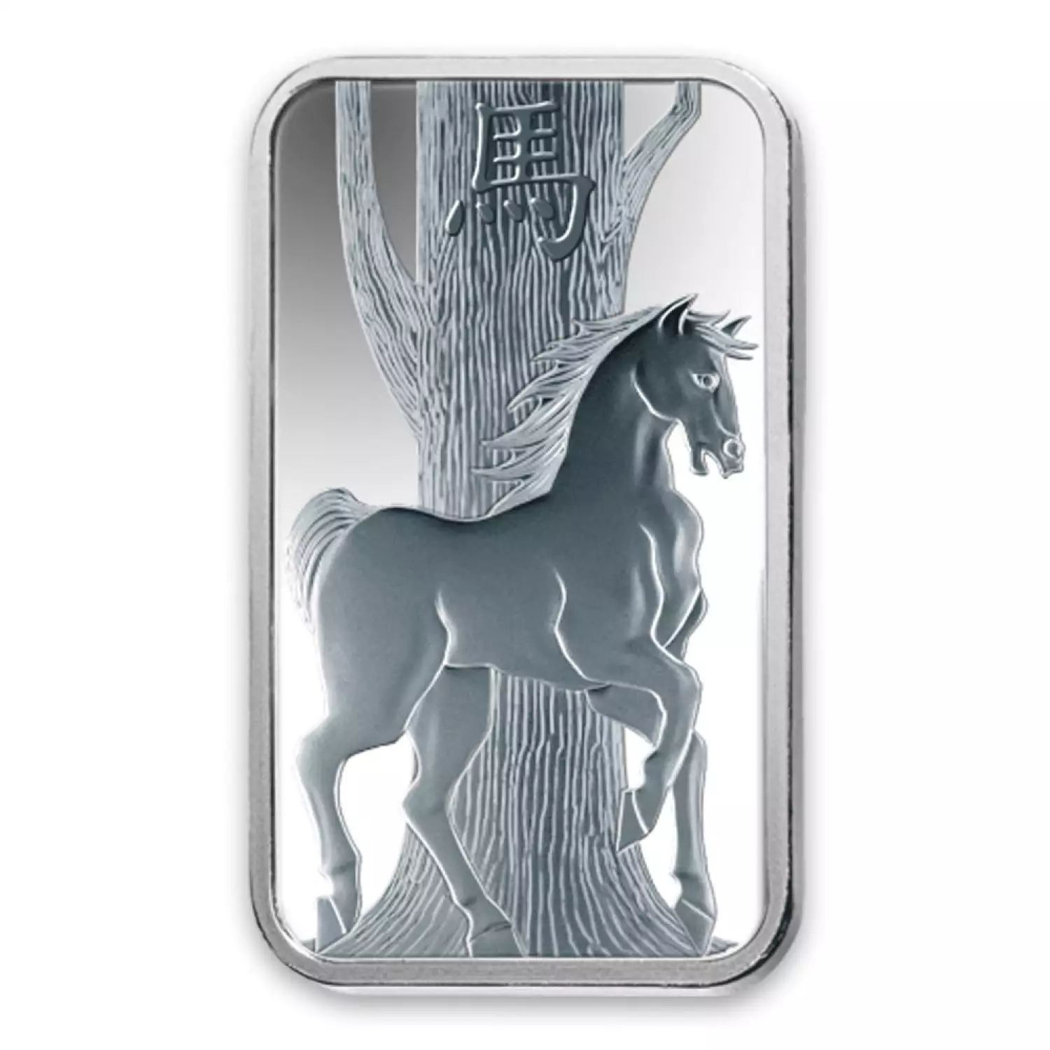 The 100g PAMP Silver Bar - Lunar Horse is manufactured in Switzerland and is composed of 100 grams of .999 pure silver. This beautiful silver bar features a horse design for the Chinese Zodiac series on the obverse.