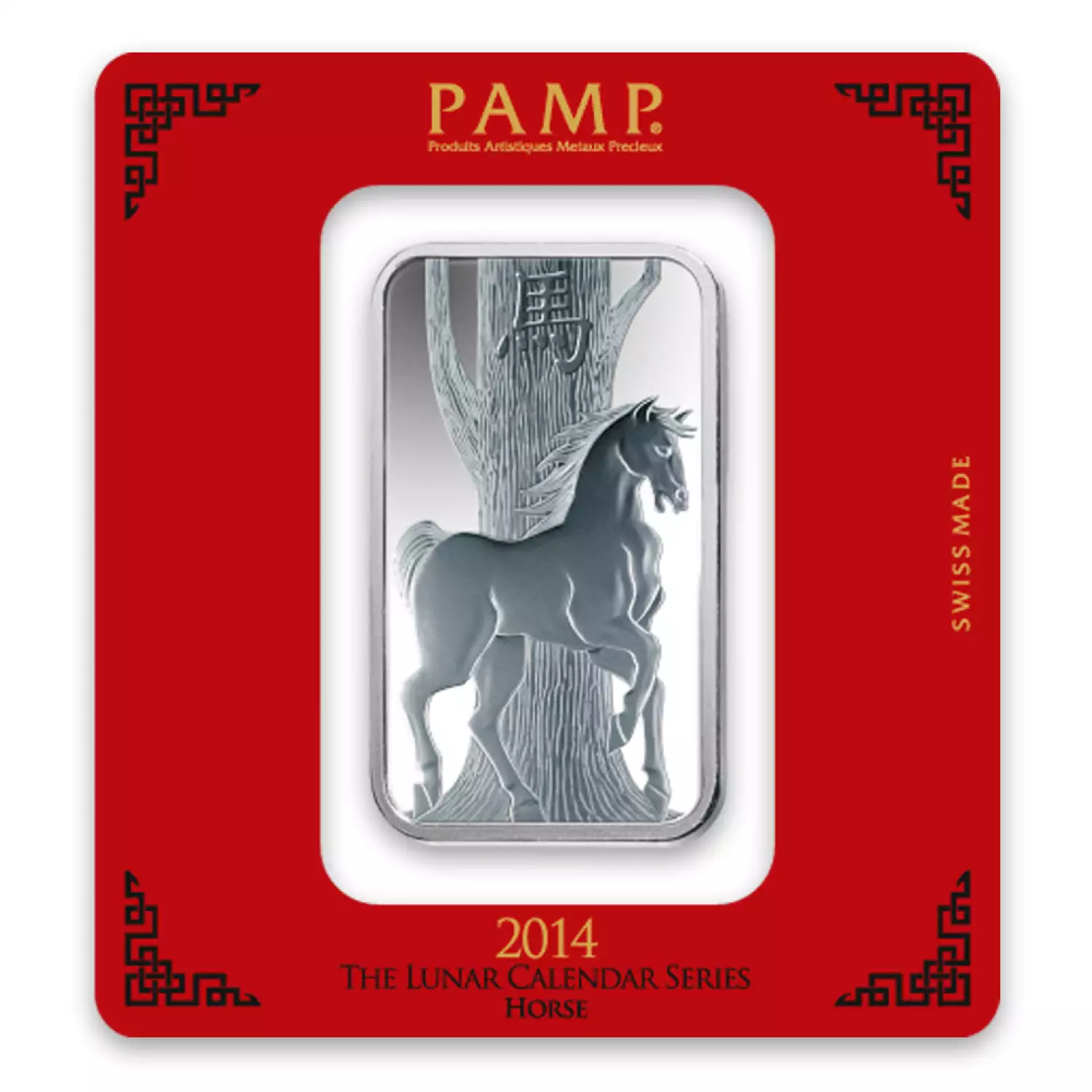 Buy the high-quality, magnificent 100g PAMP Silver Bar - Lunar Horse today from us online! The latest silver price is updated on our website every minute.