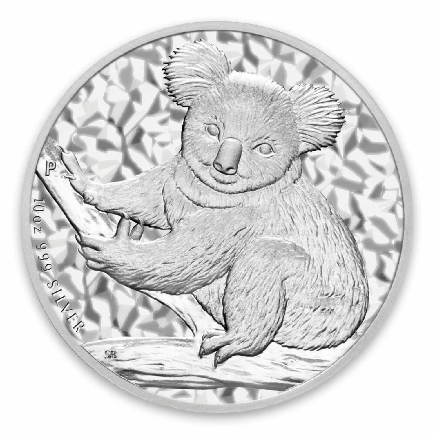 Each 2009 10oz Australian Perth Mint Silver Koala contains 10 troy ounces of .999 fine silver. The reverse of the coin features a Koala sitting in a tree branch, design by Shevaun Buschenhofen. Most investors will not buy silver bullion that is not at least 999 pure silver.