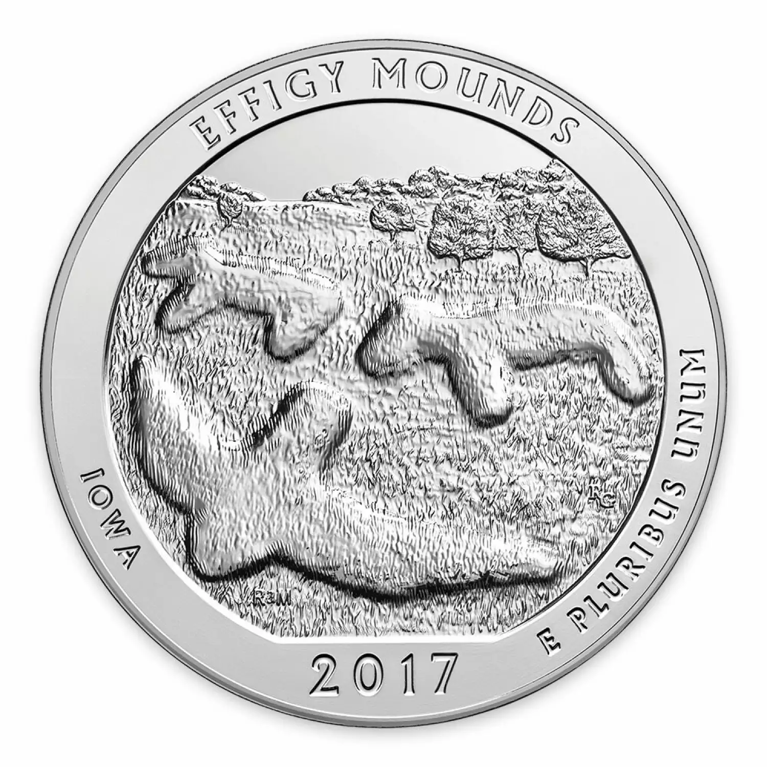 Since 2010, the US Mint released five silver America the Beautiful coins annually. The 5oz silver coins will be complete in 2021, each representing a historical monument or a treasured national park. These bullion coins were introduced following the success of the state quarter program.Effigy Mounds National Monument preserves more than 200 prehistoric mounds built by Native Americans. Numerous effigy mounds are shaped like animals, including bears and birds.