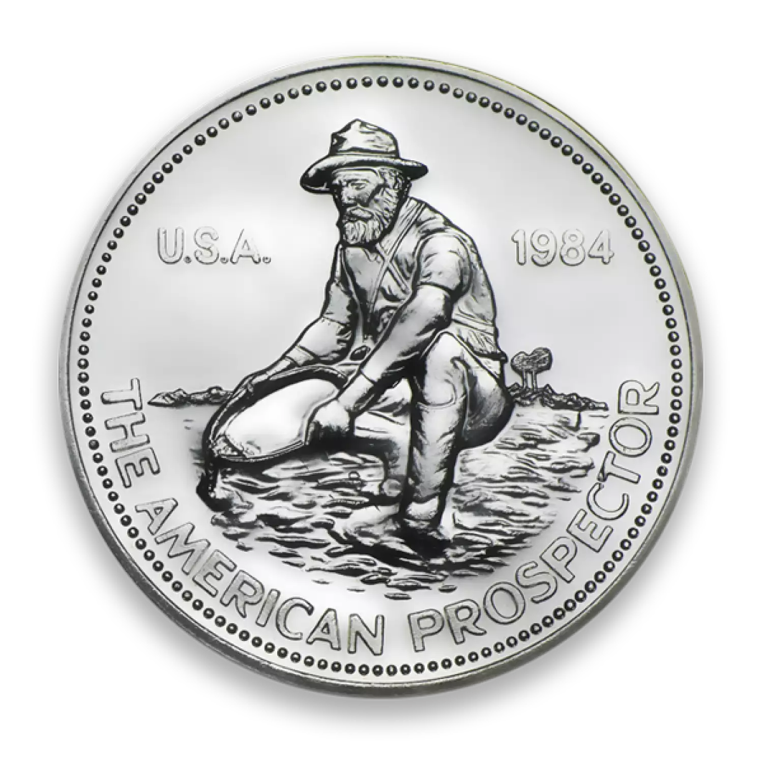 The 1oz Engelhard Silver Prospector round is probably the most famous silver round design in the world. Fractional prospector silver rounds were only released in 1985 and are not as common as the 1oz silver round. These stunning silver rounds add a sense of historical value and collectibility. The obverse of the silver round features a prospector panning for Gold, the words "U.S.A.", the year of issue, and "The American Prospector." The reverse of the silver round shows an American eagle along with the weight and purity of the round.