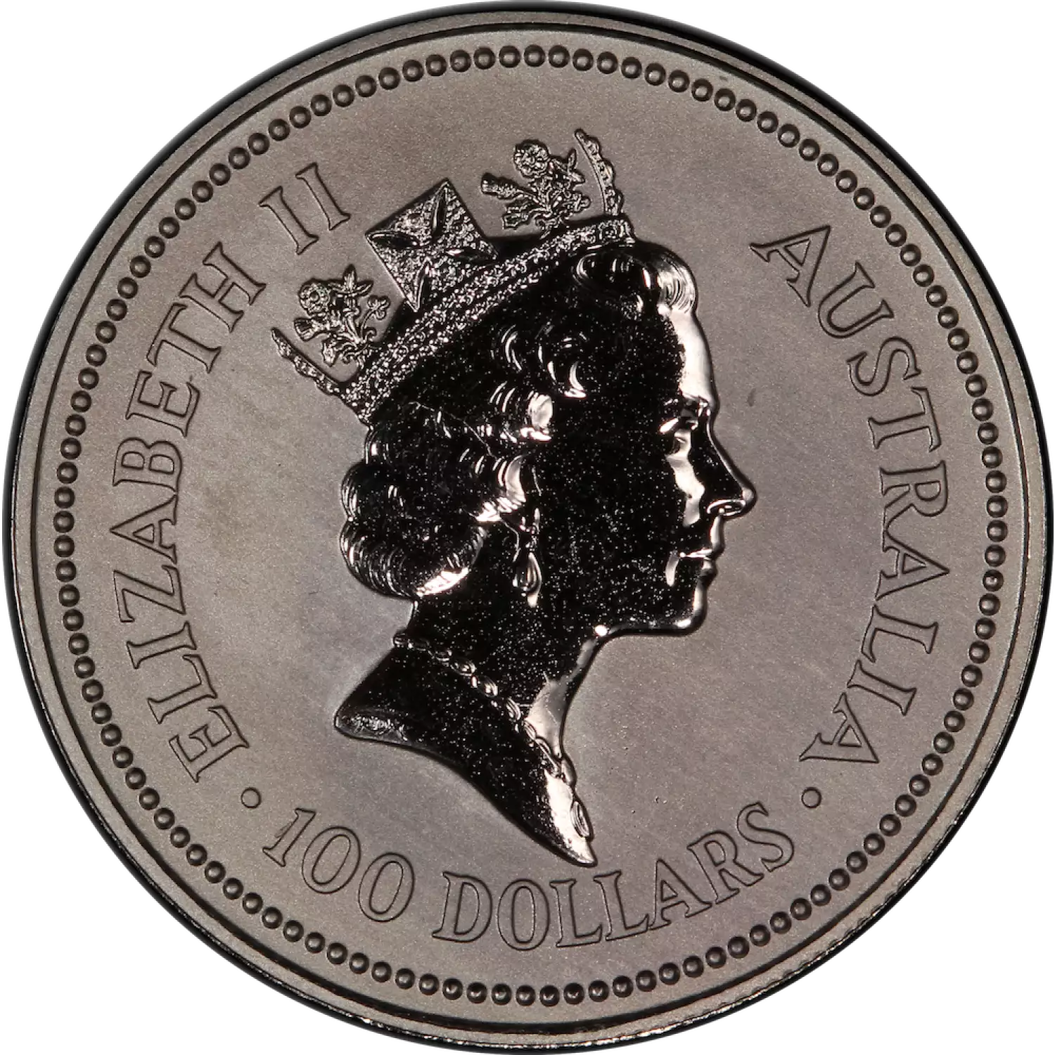 Produced by Perth Mint, each 1992 1 oz Australian Perth Mint Platinum Koala Coin contains 1 troy ounce of .9995 fine platinum. The obverse of this coin shows the right facing profile of Queen Elizabeth II, along with the year and $100 face value. A Koala is featured perched among branches on the reverse of this coin.
