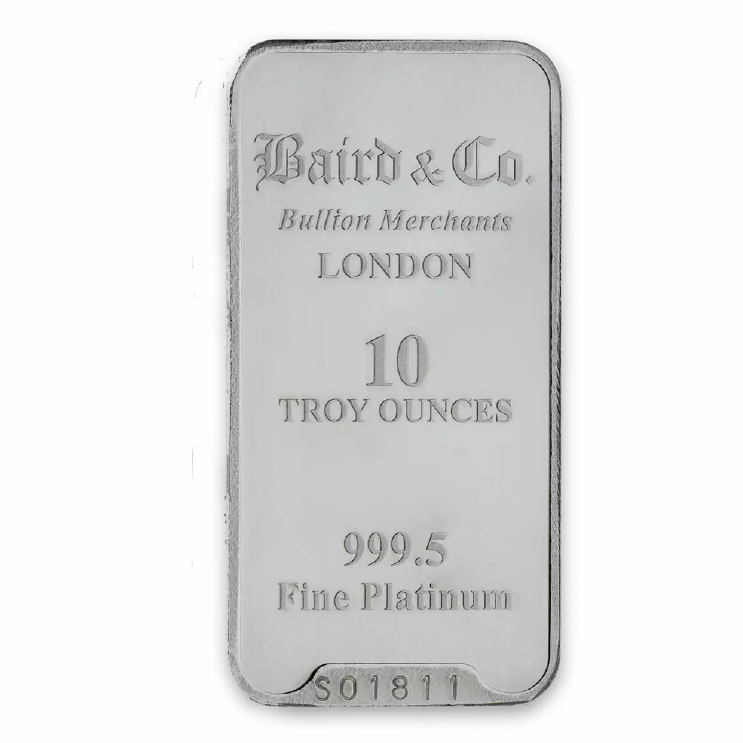 Platinum bars are available in three different types i.e. cast, minted or extruded. Manufactured by Baird & Co in the UK, each 10oz Baird Co Platinum Minted Bar contains 10 oz of .9995 fine platinum. These stunning platinum bars appeal to both investors and collectors for their iconic designs. Platinum bars and platinum coins may tend to tarnish over time depending upon the environment they are stored.