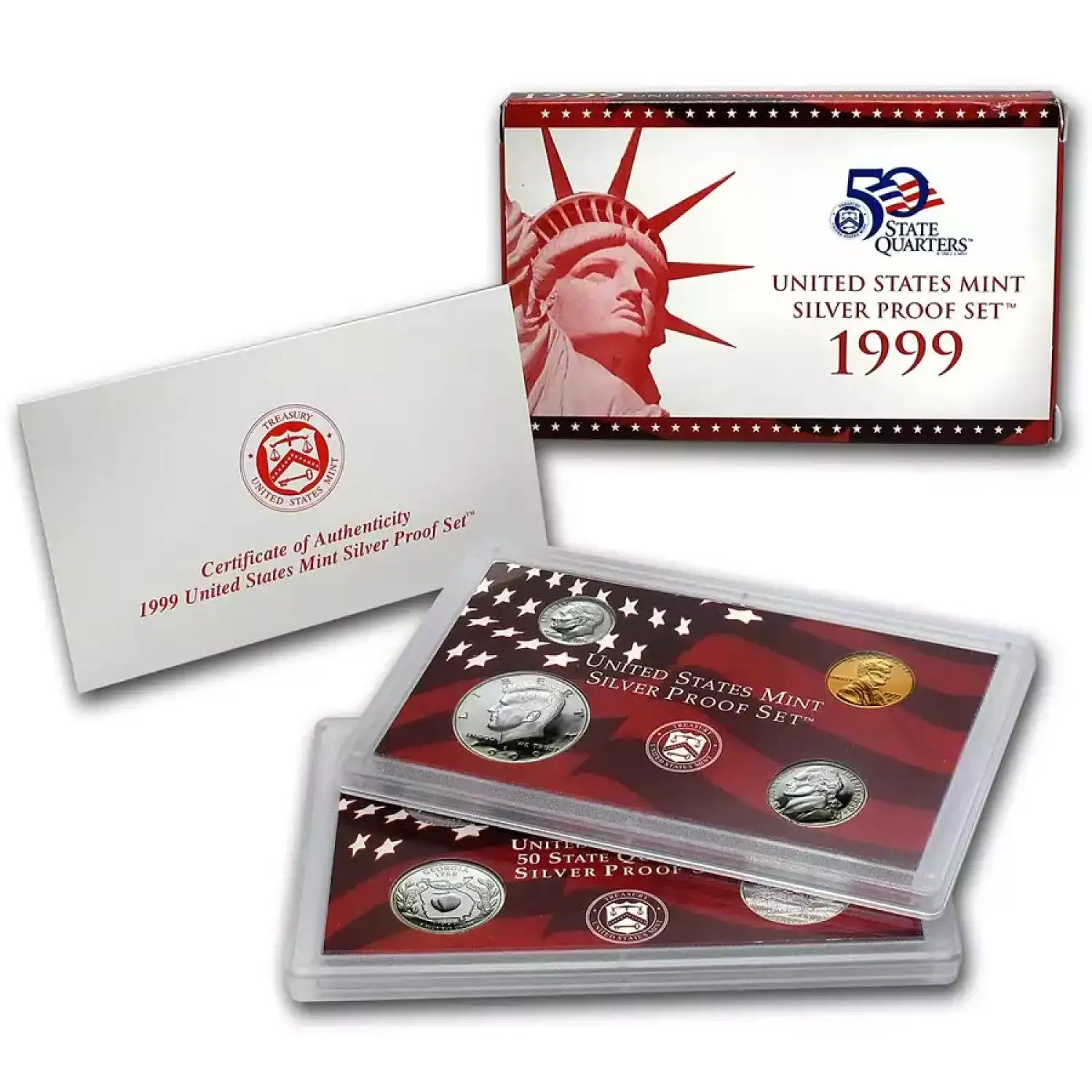 THE SET YOU RECEIVE IS OUR CHOICE. IT WILL BE A SET ESTIMATED TO BE OF THE GRADE / QUALITY INDICATED. THE IMAGE SHOWN IS AN EXAMPLE ONLY. Mint Proof Set - 1999S Silver 9-Piece ($1.91 FV) - Set
