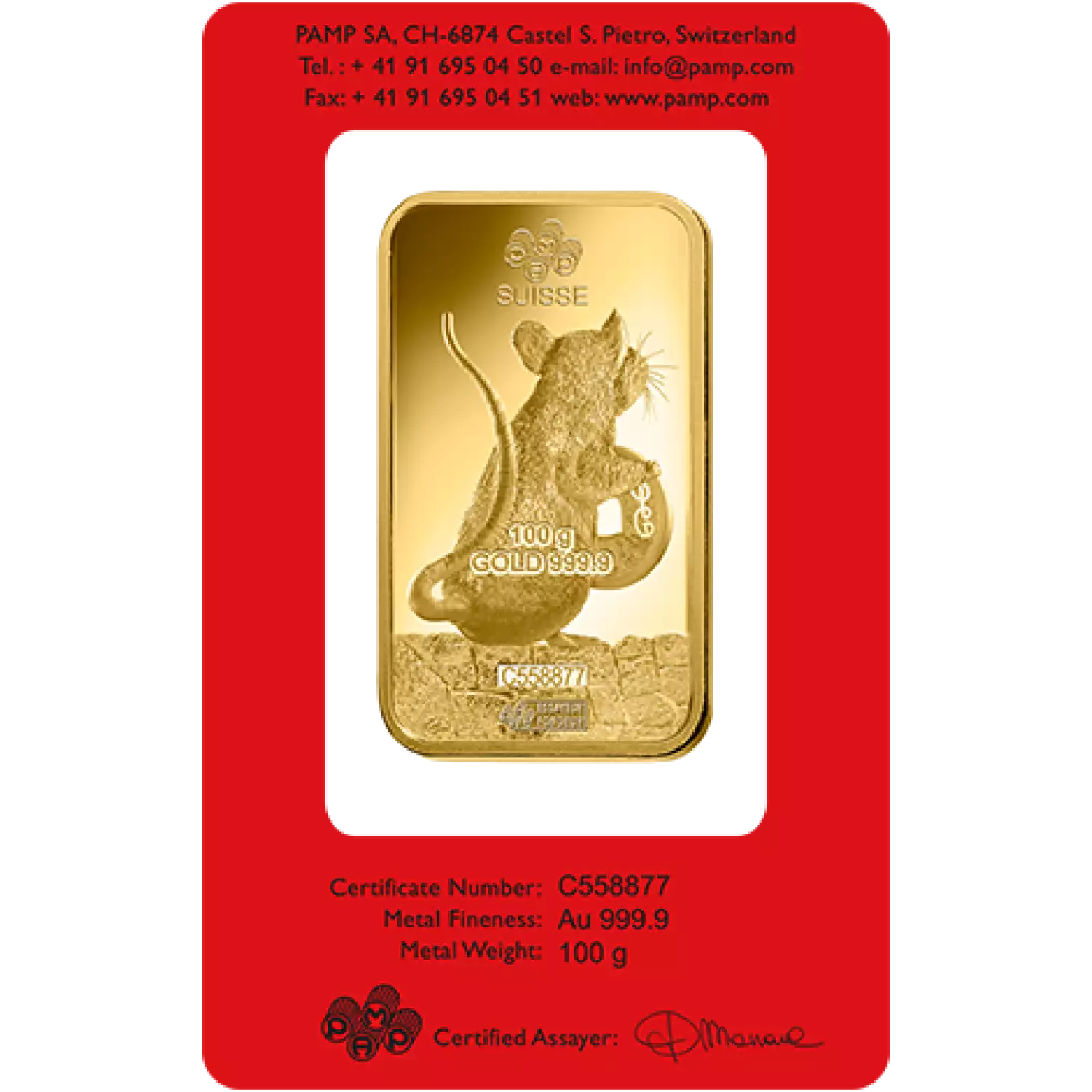 PAMP commemorates the lunar calendar by producing a new design every year. This pure gold bar's price is determined by the spot price of gold and includes the cost of manufacturing and distribution on top of it. The 100g gold bar is equivalent to 3.215 troy ounces of gold.