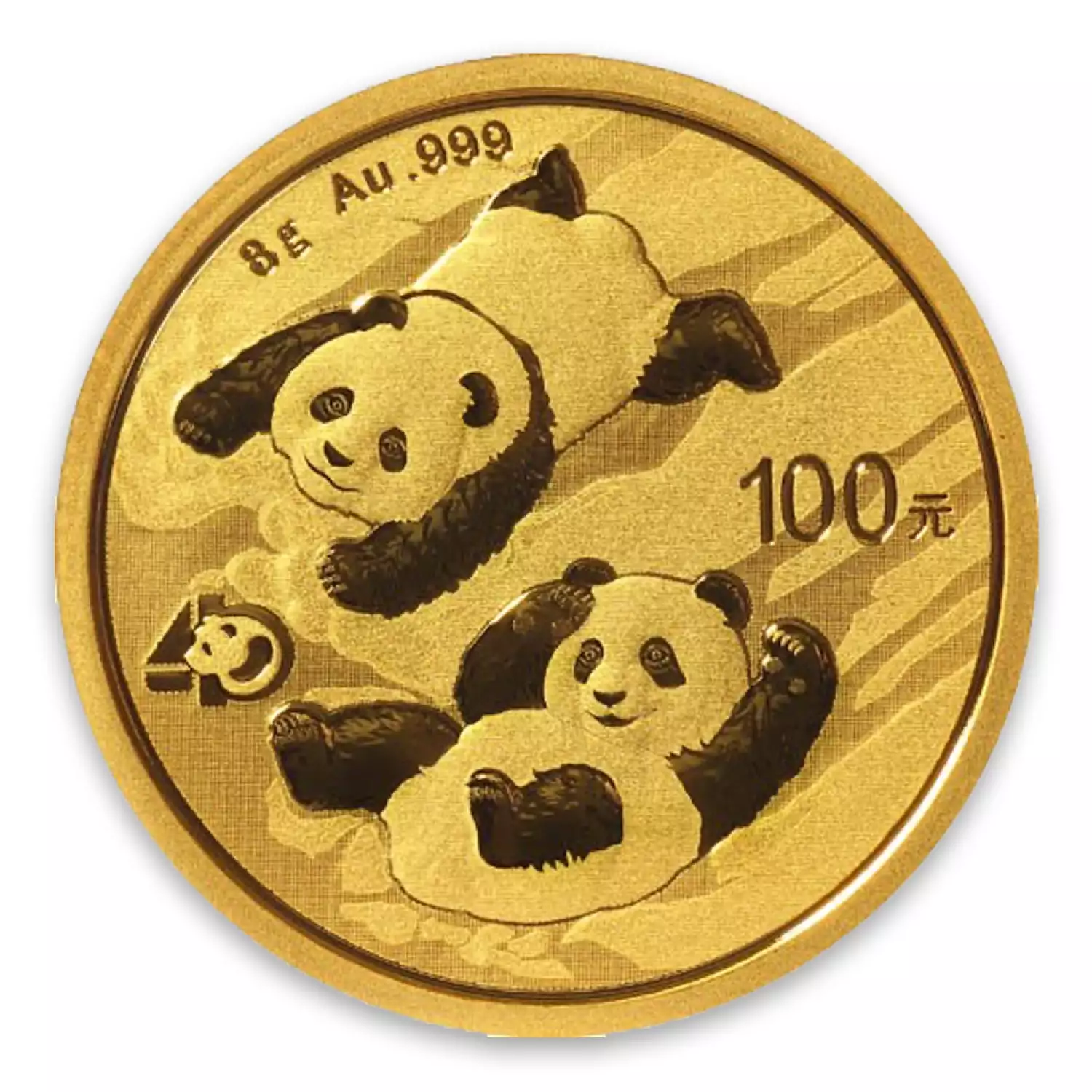 The Chinese Mint celebrates the 40th anniversary of the Chinese Panda coins series. The 2022 8g Chinese Gold Panda Coin features two Panda bears playing in the snow and a special anniversary privy mark.