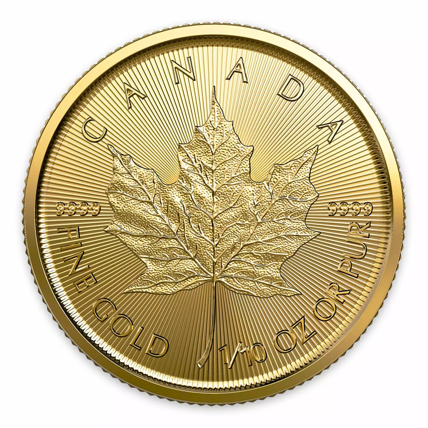 The 2022 1/10 oz Canadian Maple Leaf gold coin is the 43rd release of the 1/10 oz Canadian Gold Maple Leaf coin. It contains 1/10 oz of .9999 fine Gold. The weight and purity of this coin is guaranteed by the Royal Canadian Mint. These coins are highly popular among investors and collectors.