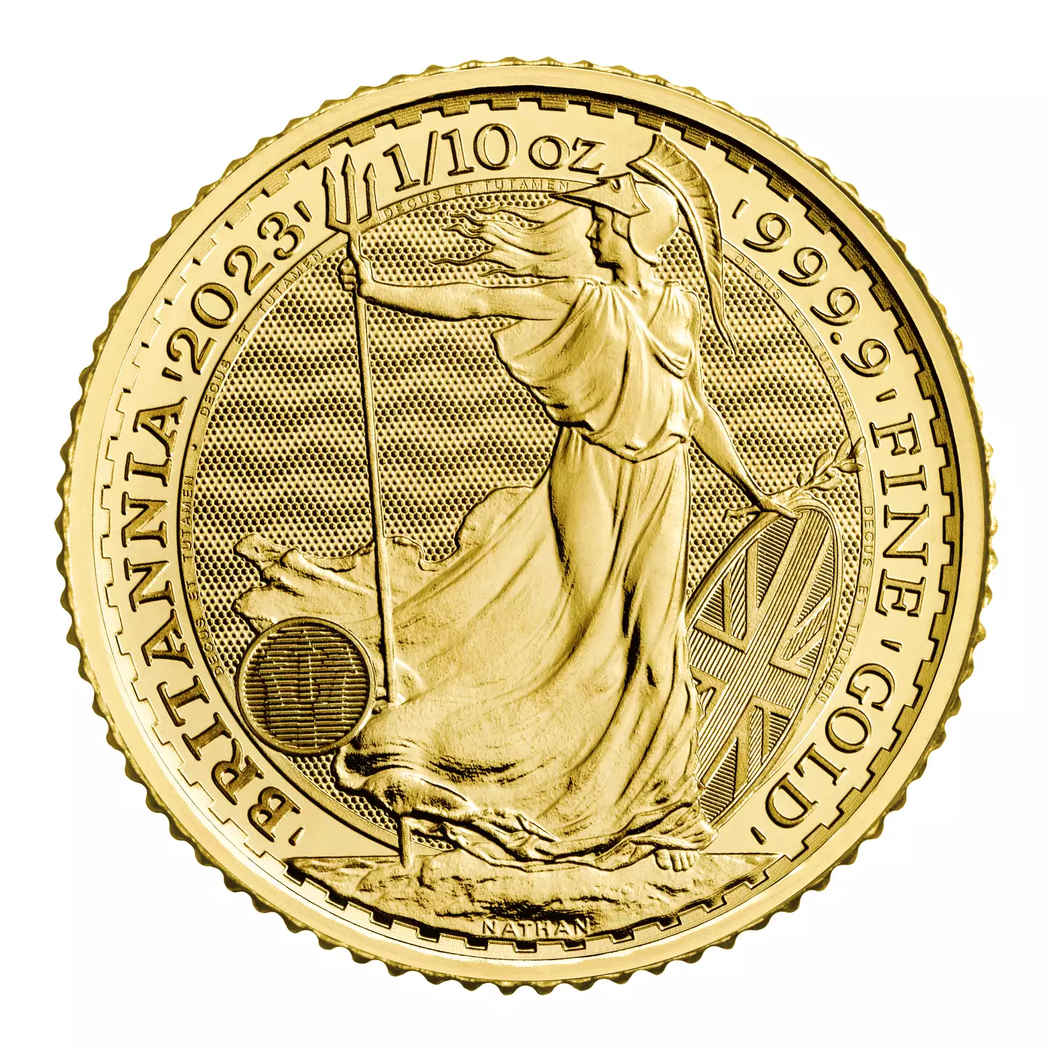 The British Gold Britannia continues to provide beauty and reliability. The 2023 1/10oz British Gold Britannia is one of the most popular investment coins in the world. Each 2023 1/10oz British Gold Britannia contains 0.1 troy ounce of .9999 fine gold. The reverse, designed by Philip Nathan has never changed since the first Britannia bullion coin in 1987. The Britannia has been a symbol through out the history and it’s first appeareance on the Roman coins is dating back over 2000 years ago.