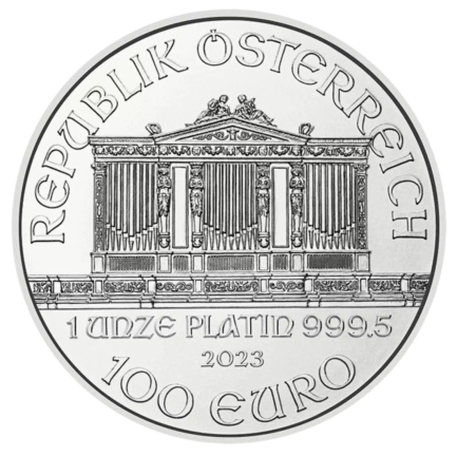 Guaranteed by the Australian Mint, the 2023 1oz Austrian Platinum Philharmonic is composed of 1 troy ounce of .9995 fine platinum. The obverse of the coin depicts the Great pipe organ in the Gold Hall of the Wiener Musikverein.