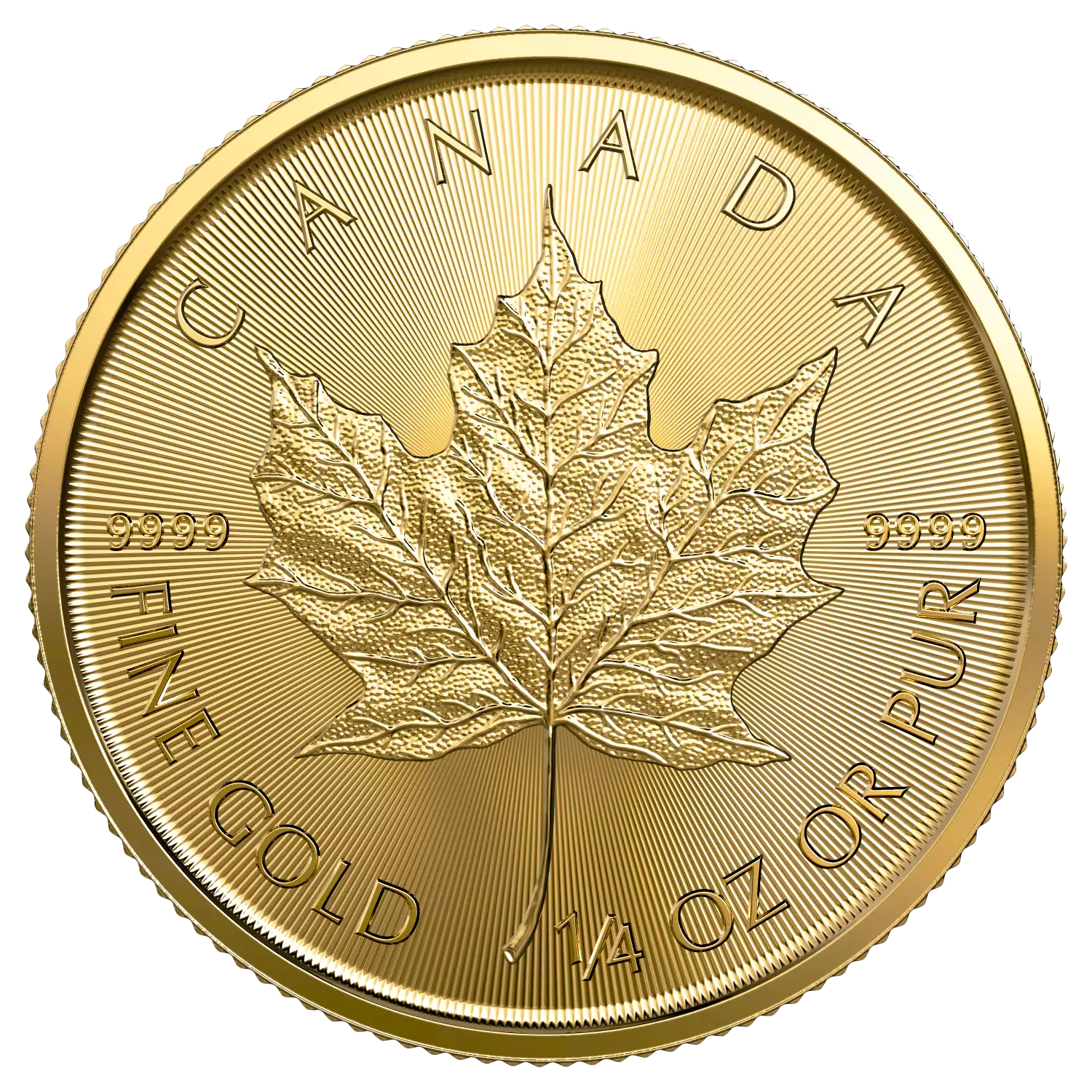 The 2023 1/4 oz Canadian Gold Maple Leaf coin contains 1/4 oz of .9999 fine Gold. The weight and purity of this coin is guaranteed by the Royal Canadian Mint. These 2024 maple leaf gold coins are highly popular among investors and collectors.