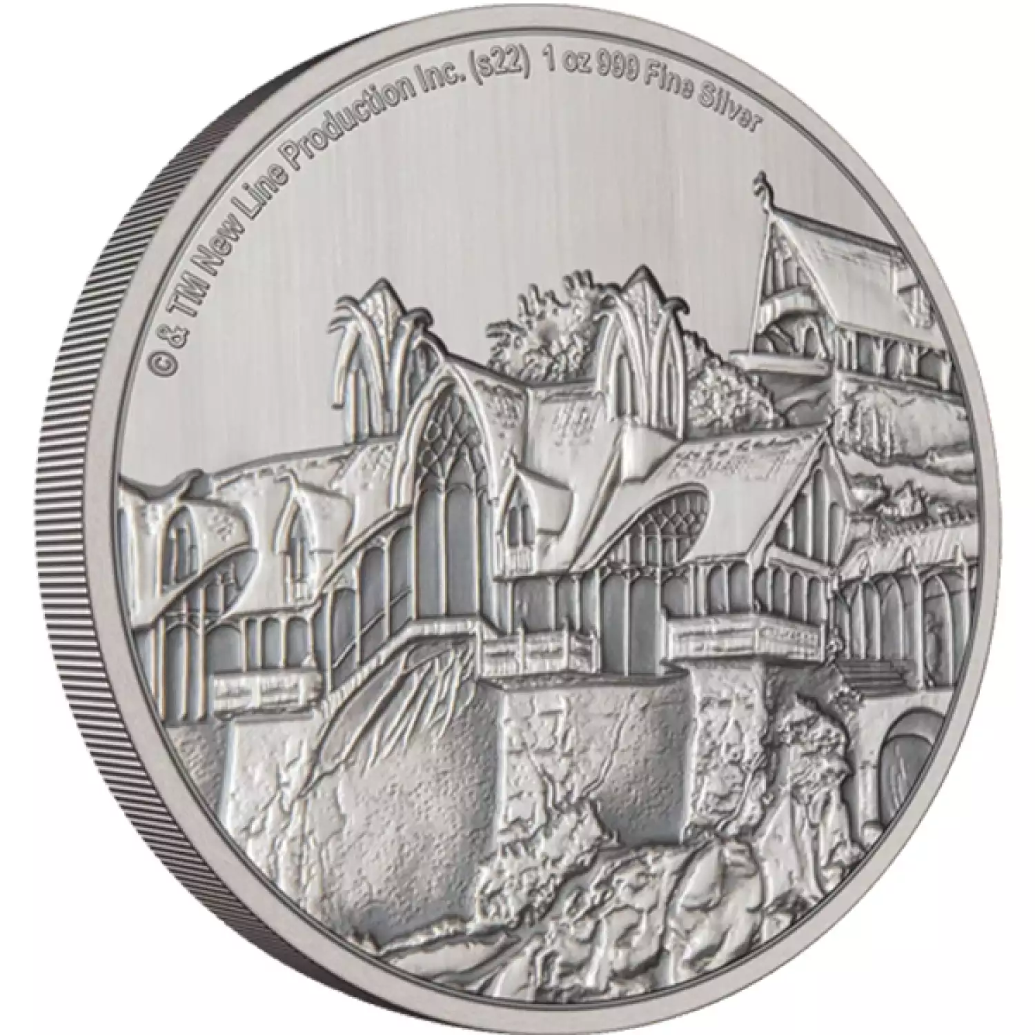 This 1oz silver coin features a fully engraved close-up image of Elrond’s house - the elven refuge, Rivendell, from THE LORD OF THE RINGS™. It is antiqued, and relief has been added to further enhance the design.
