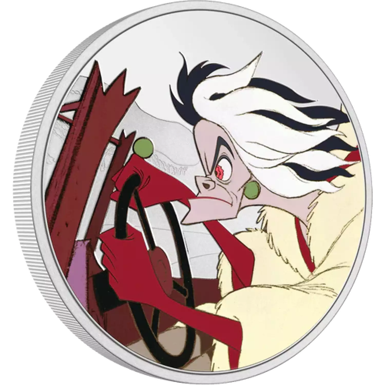 Made from 1oz of pure silver, this de-vil-ishly charming piece displays a fur-raising moment from the film where the outlandish and obsessed Disney’s Cruella is chasing after the puppies in her car.