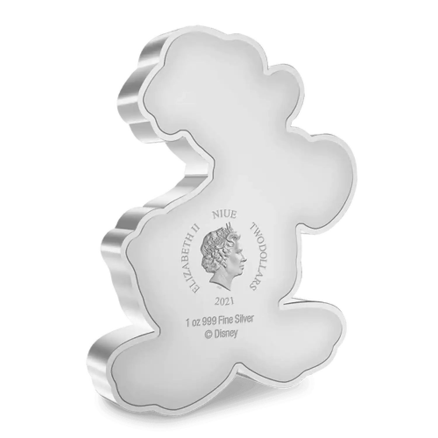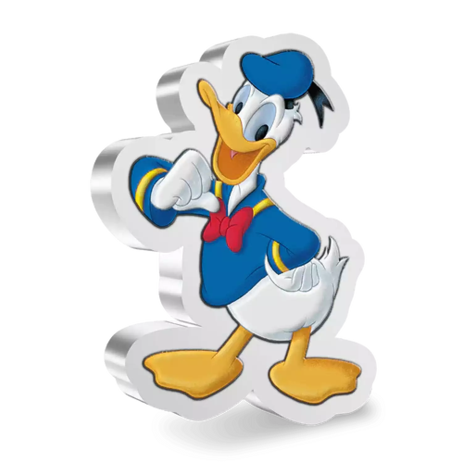 Delight in our Donald Duck 1oz Silver Coin, shaped and coloured to represent this Disney favourite. A smiling Donald is depicted in a classic pose, dressed in his traditional sailor shirt, cap, and bow tie. The obverse of the coin bears the Ian Rank-Broadley effigy of Her Majesty Queen Elizabeth II, confirming it as legal tender.
