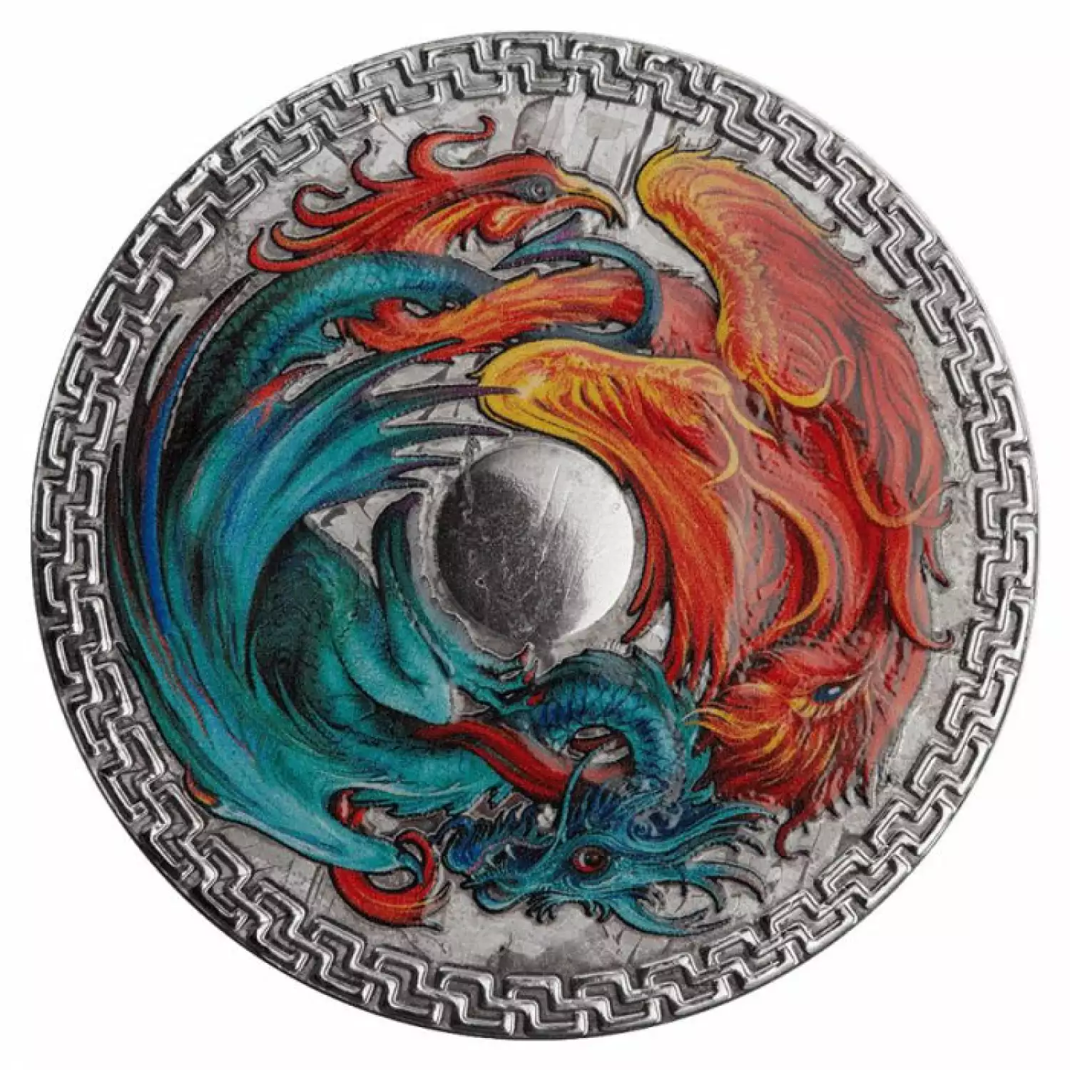 This stunning partially colorized coin honors the symbolism of the Phoenix and the Dragon in Chinese culture. The phoenix, a symbol for peace and prosperity, is considered to be the embodiment of Yin, while the dragon is a representation of the Yang attributes of power and wealth. The phoenix and dragon depicted together are emblematic of bliss and happiness. The coin is crafted from a genuine shard of the Aletai meteorite which impacted the earth 65 million years ago in a site that is now part of China.