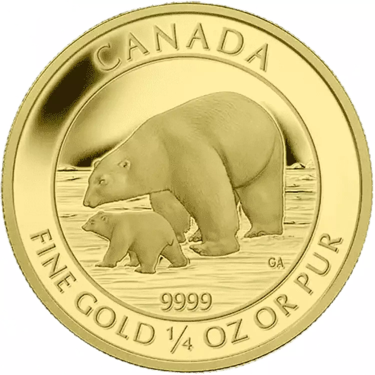 The Polar Bear and Cub design from the Royal Canadian Mint was designed by artist Germaine Arnaktauyok and used on various coins from the mint that year. In addition to these 2015 1/4 oz $10 Canadian Gold Polar Bear and Cub Coin in Brilliant Uncirculated condition, you’ll find a gold proof version and a silver proof version.