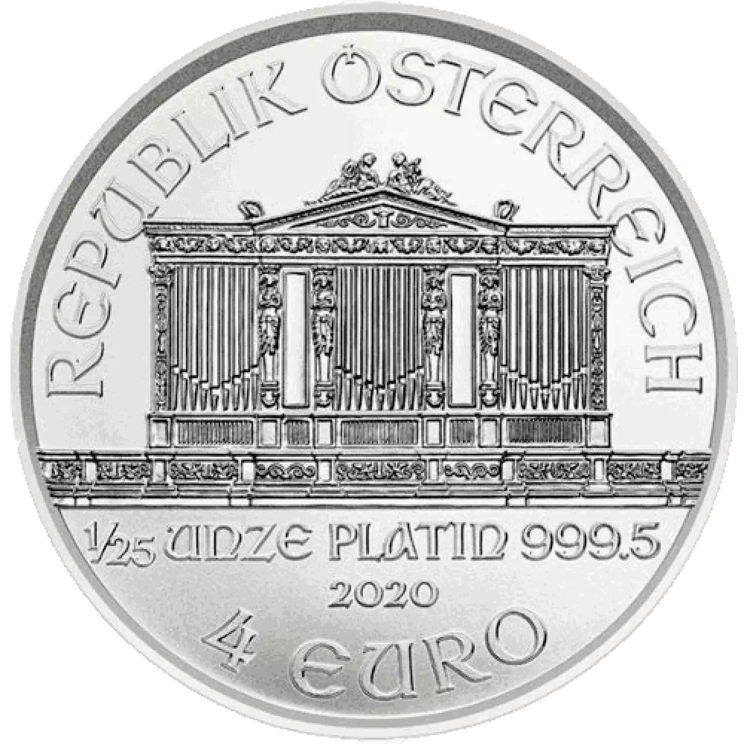 Backed by the Austrian Mint, the 2024 1/25 oz Austrian Platinum Philharmonic is crafted from 0.04 troy ounces of .9995 fine platinum. The obverse of this coin features a depiction of the grand pipe organ located in the Gold Hall of the Wiener Musikverein.
