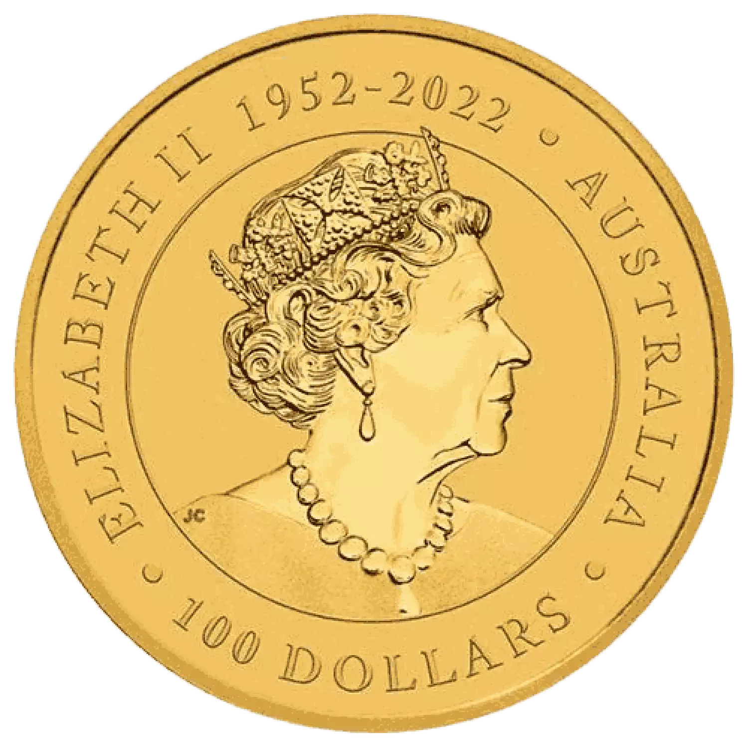 Originally known as the Gold Australian Nugget, the Bullion Kangaroo Coin is the one of the largest bullion coin program from the Perth Mint. The first 1 oz Australian Perth Mint Kangaroo Coin was released in 1991. The 2024 1 oz bullion coin is guaranteed by the Australian Government. The obverse features the Ian Rank-Broadley likeness of Queen Elizabeth II. The Reverse portrays a single iconic hopping red kangaroo surrounded by rays of sunlight.