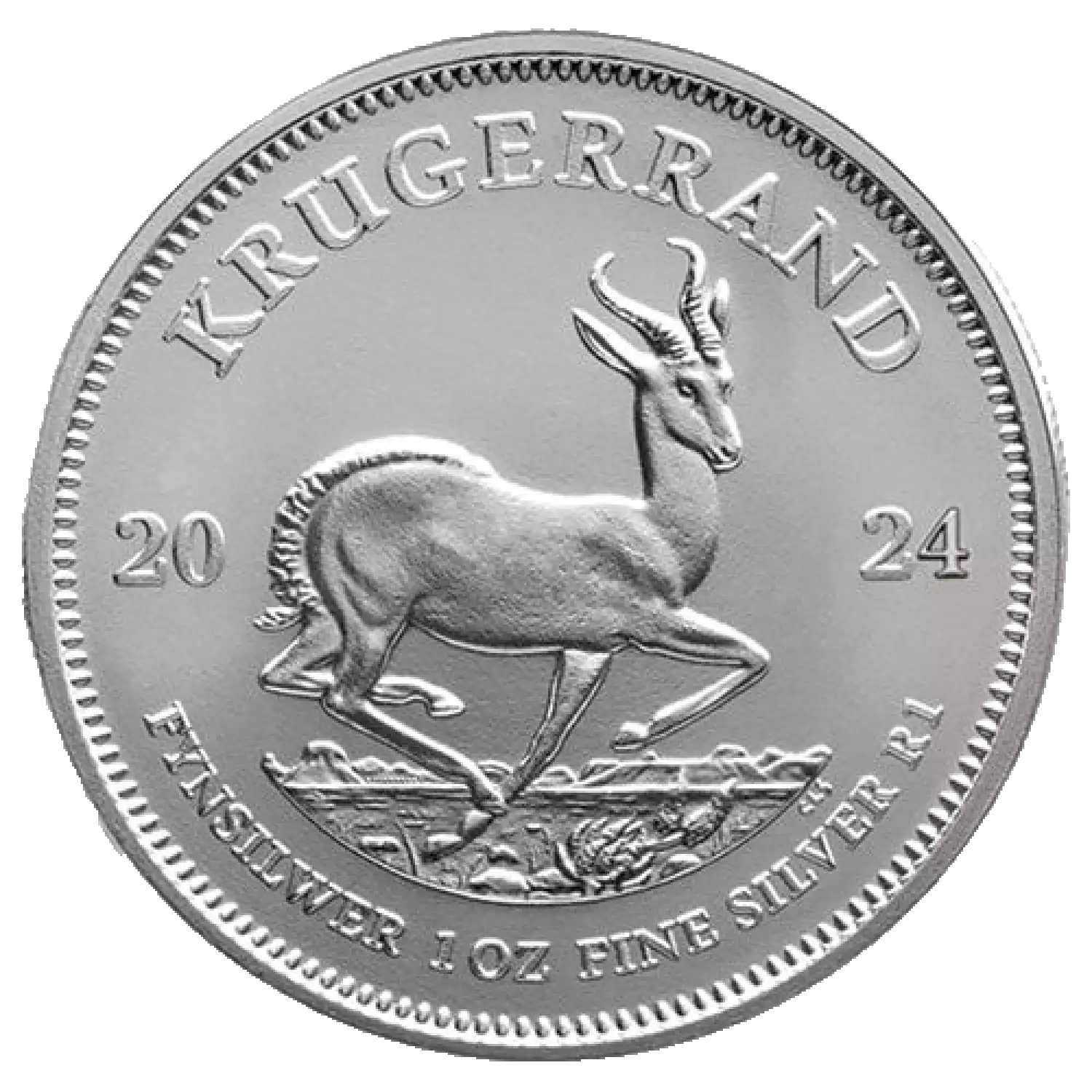 2024 South Africa 1oz Silver Krugerrand. This Brilliant Uncirculated coin has become widely popular among investors and collectors. The Silver Krugerrand has the same design as the beloved Gold Krugerrand coin. This well-known design has stayed the same since it was first introduced in 1967. The obverse shows the South African Republic's first president, Paul Kruger, while the reverse features a springbok, the national animal, as well as the date of minting.