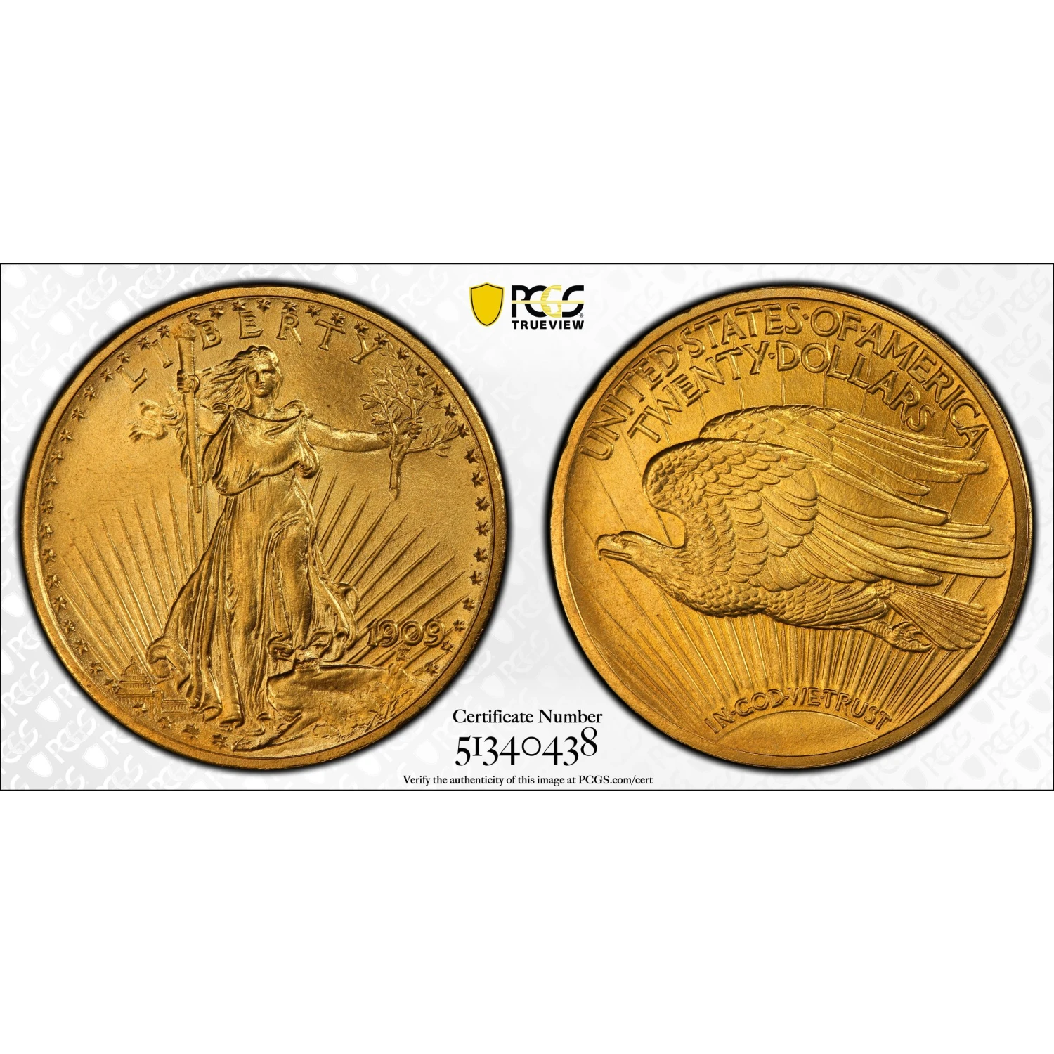 Introducing the remarkable 1909 P Double Eagles Saint Gaudens PCGS PR-65 numismatic coin, a true masterpiece of American craftsmanship and a cherished piece of history. This stunning gold coin, minted in the United States, is a testament to the enduring legacy of the renowned sculptor and designer, Augustus Saint-Gaudens.