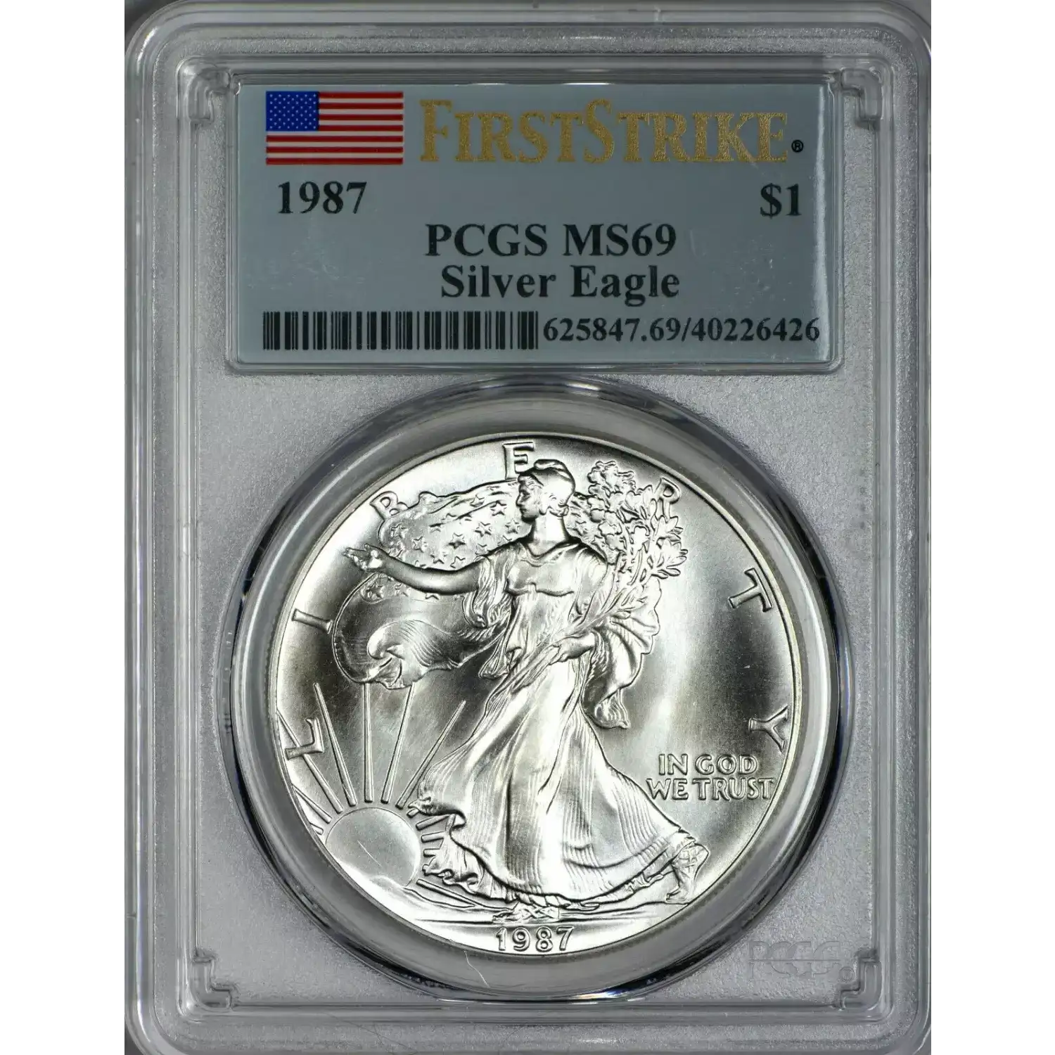 1987 Silver Eagle PCGS MS69 First Strike Flag Label