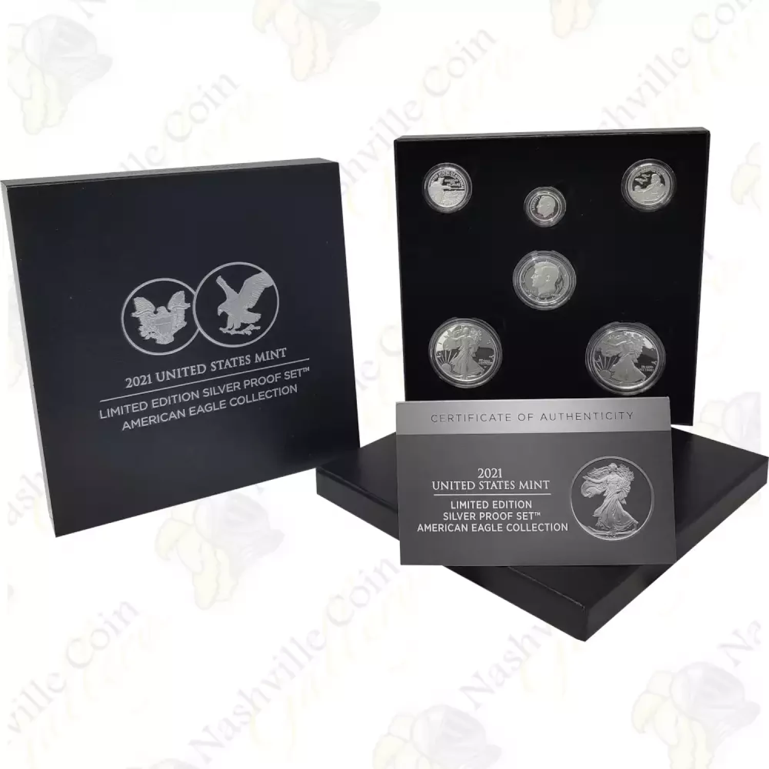 THE SET YOU RECEIVE IS OUR CHOICE. IT WILL BE A SET ESTIMATED TO BE OF THE GRADE / QUALITY INDICATED. THE IMAGE SHOWN IS AN EXAMPLE ONLY. Mint Proof Set - 2021S 8 Piece Limited Edition Silver ($3.10 FV) - Set Includes both Type 1 and Type 2 Silver Eagles