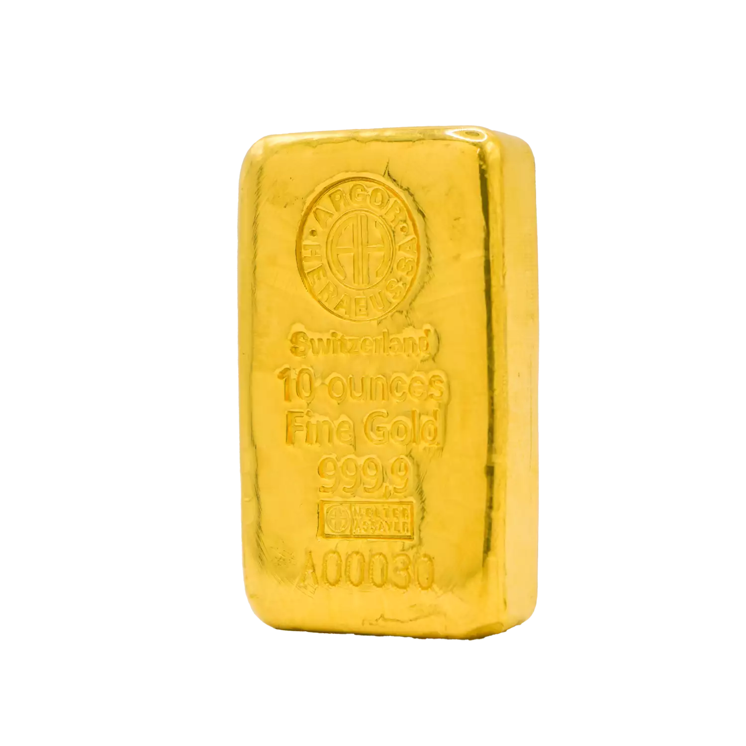 Each 10 oz gold bar from Argor-Heraeus is minted with precise attention to detail, ensuring a consistent weight and purity of 0.9999 fine gold. The bar's weight and gold content are stamped on the reverse, alongside the Argor-Heraeus hallmark and a unique serial number. This serial number serves as a guarantee of the bar's authenticity, verifying its origin and quality.