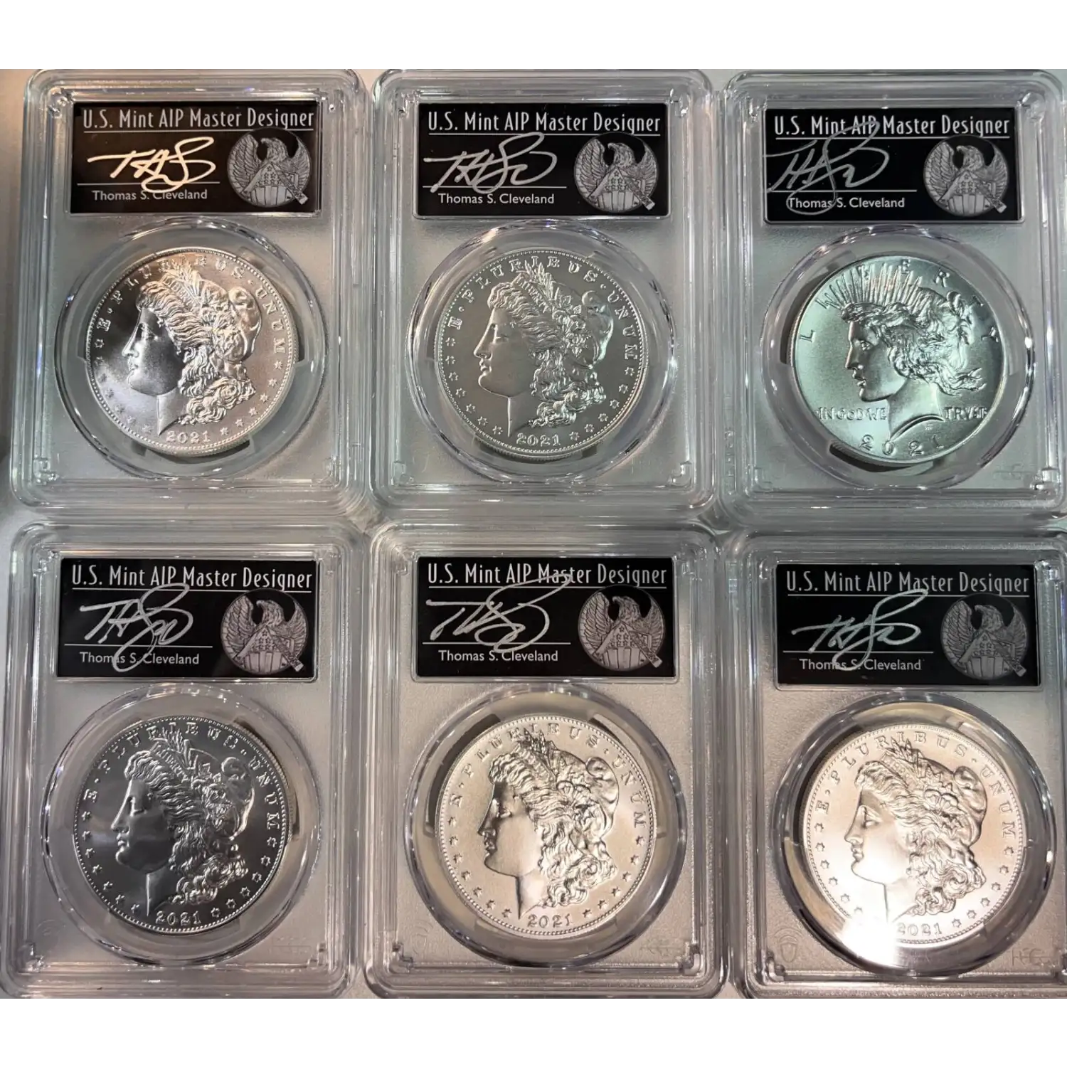 2021 Uncirculated Morgan/Peace Silver Dollar 6 Pc Set PCGS MS70 First Day of Issue Thomas Cleveland Signature