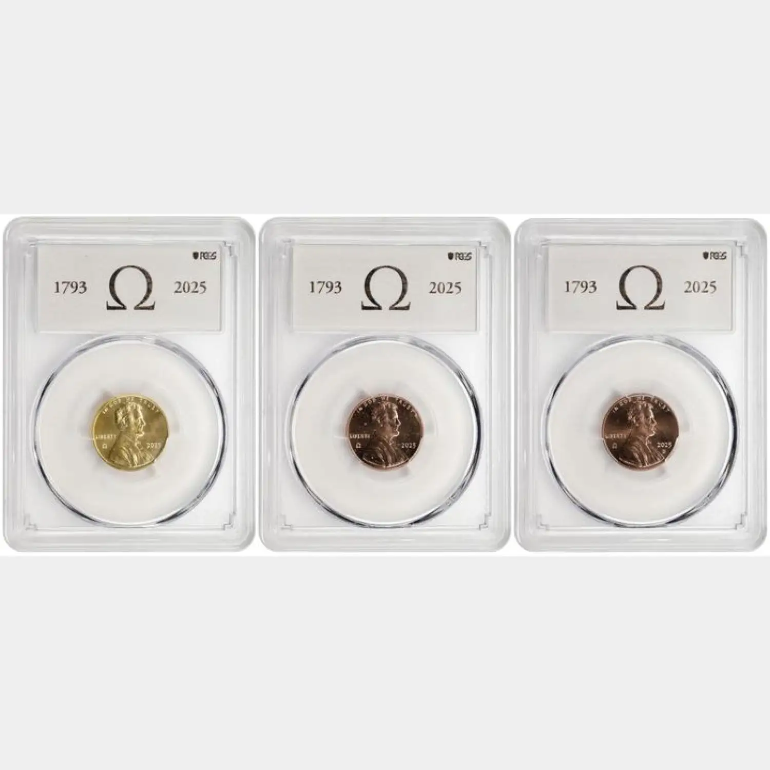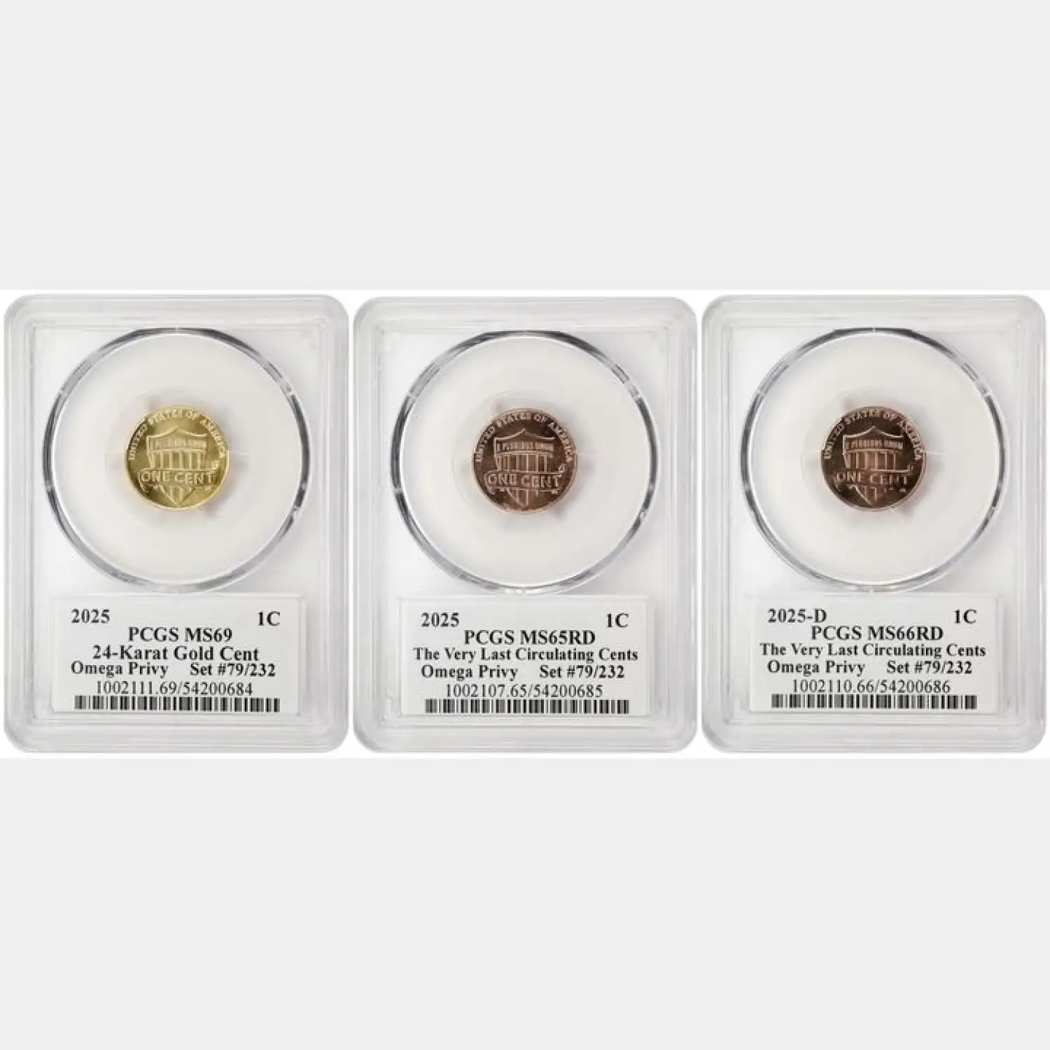 Omega Privy Mark 2025 Lincoln Cents Three-Coin Set. The Last Circulating Cents. Set Number 79 of 232. (PCGS).
