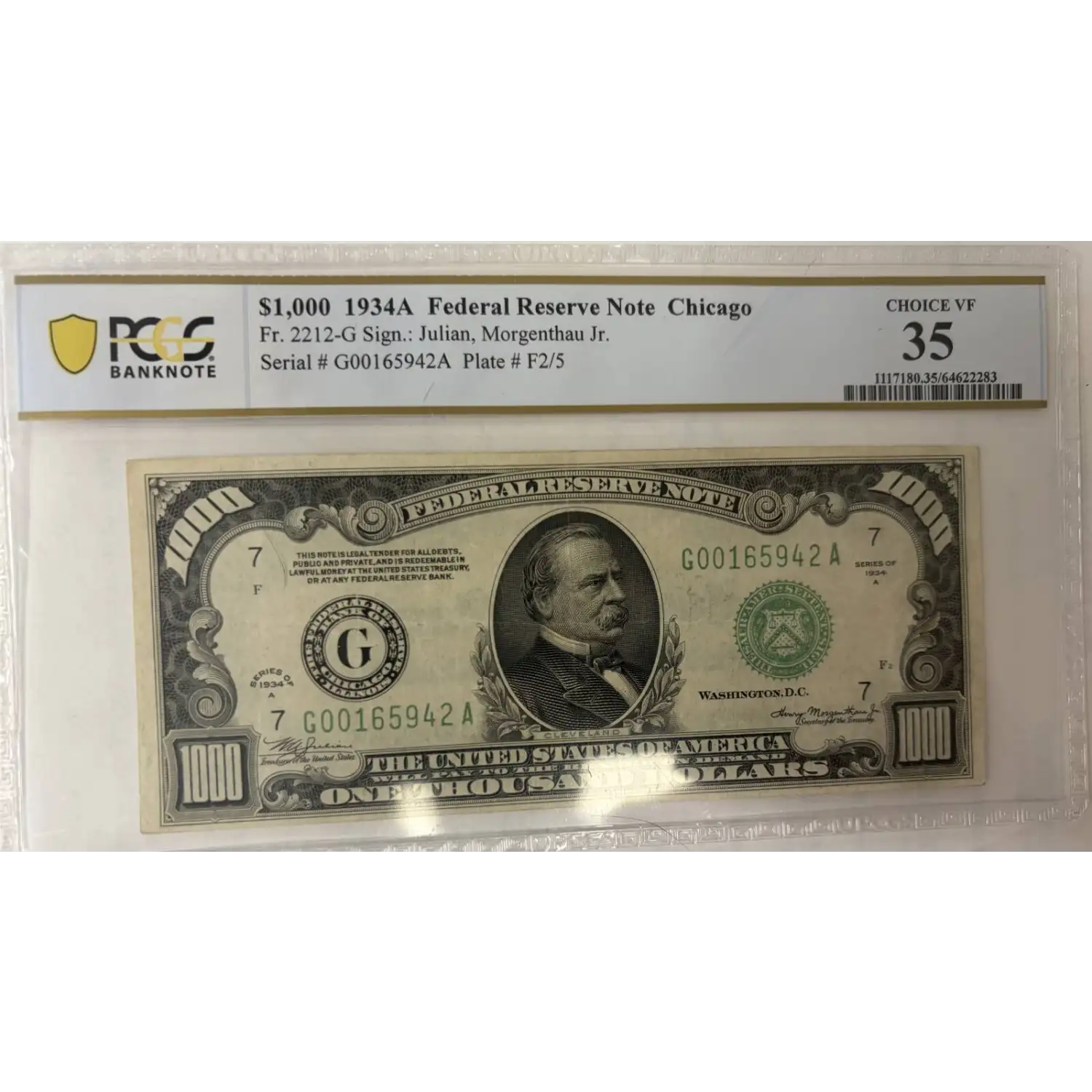 Discover the rare and prestigious 1934-A $1,000 High Denomination Note, a cornerstone of American numismatic history. This collectible paper money, certified by PCGS at grade 35 (Very Fine), exemplifies the elegance of pre-World War II U.S. currency designed for elite financial transactions.