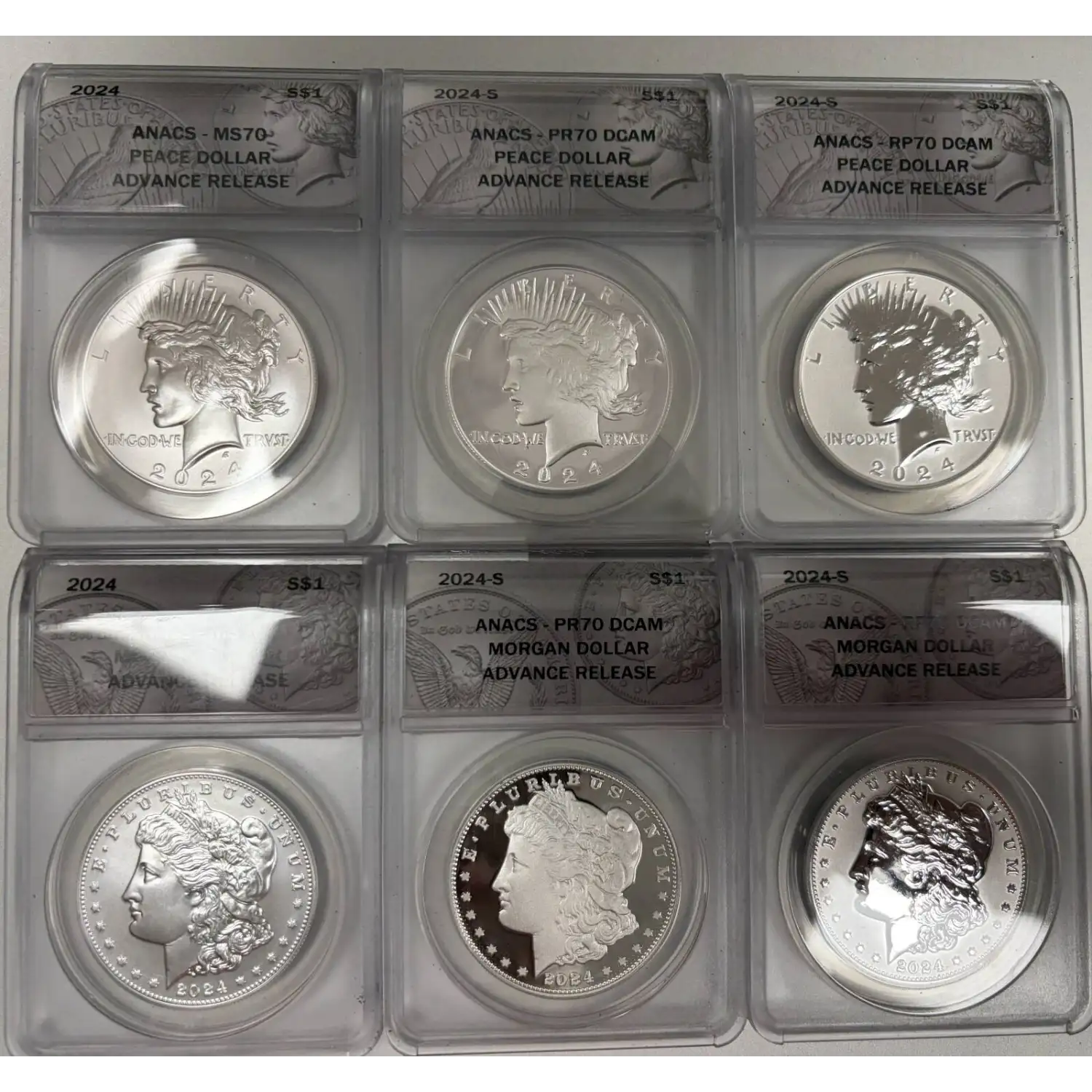 Discover the timeless elegance of American numismatics with the 2024 6 pc Set Uncirculated Proof Morgan Peace Silver Dollar ANACS 70 Advanced Release. This exquisite collection revives two iconic U.S. silver dollar designs in pristine condition.