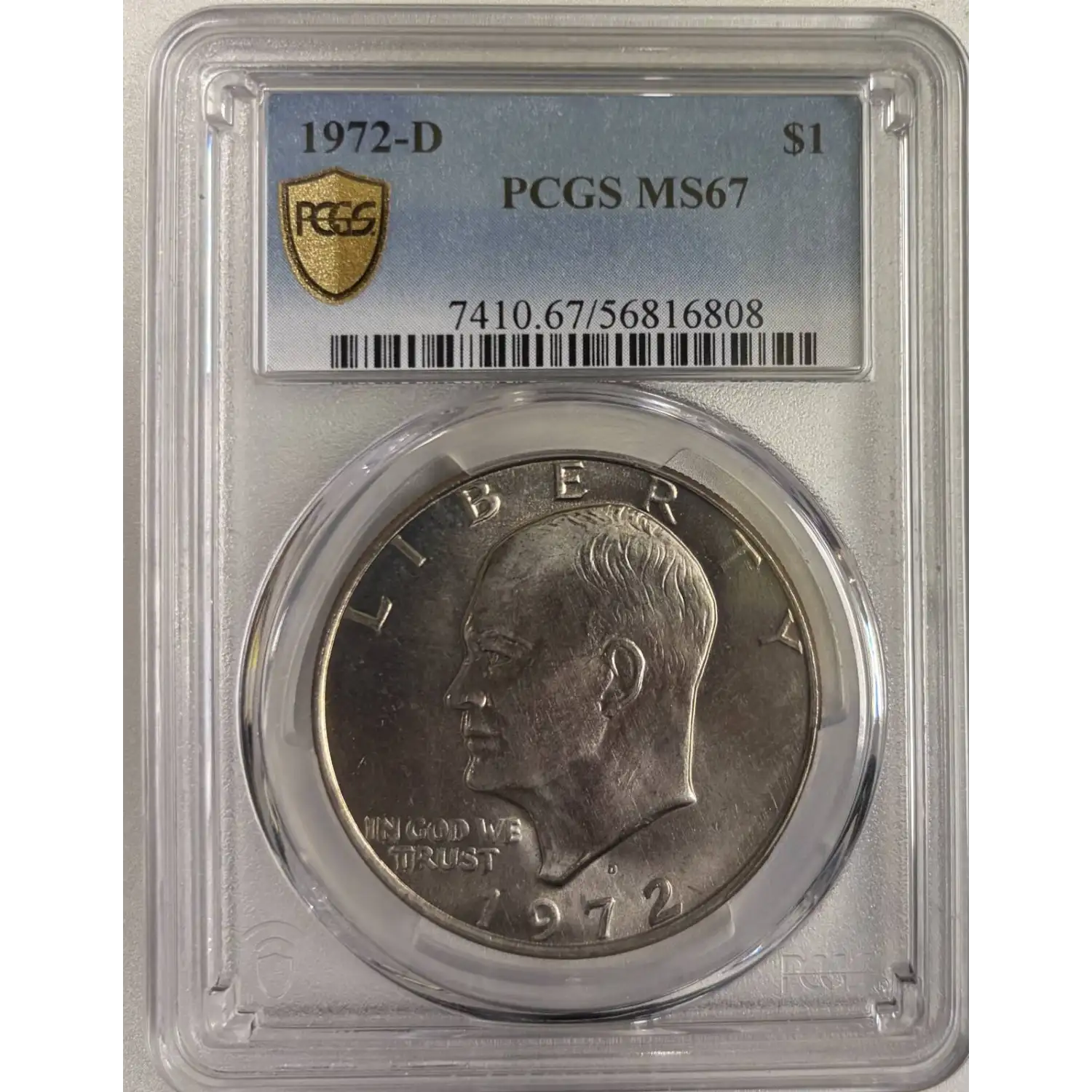 Discover the stunning 1972 D Eisenhower Dollar, a premium numismatic coin from the United States Mint. This PCGS MS-67 graded example showcases exceptional quality and preservation, making it a must-have for collectors of American silver dollars and Eisenhower series.