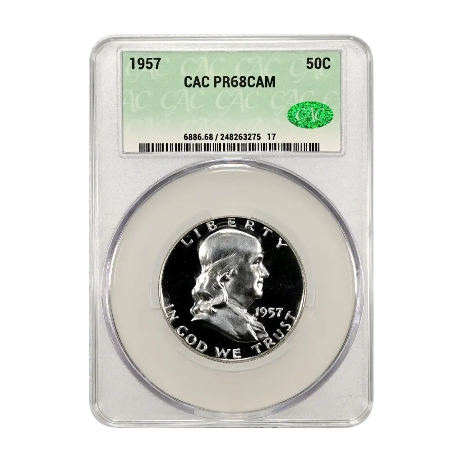 Discover the exquisite 1957 Franklin Half Dollar, a premium proof coin from the United States Mint, now authenticated and graded CACG PR 68 CAM. This numismatic treasure showcases the iconic Benjamin Franklin design, celebrated for its sharp cameo contrast and pristine condition, making it a must-have for collectors seeking high-grade American silver coins.